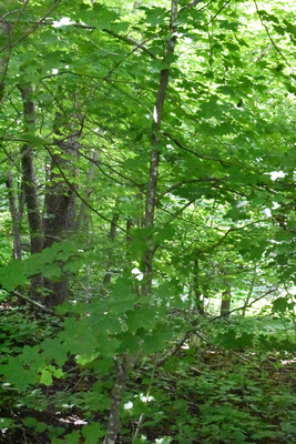 Arisaema triphyllum is a perennial herb, which grows from a corm, reaching 50 to 6 0 cm in height. Jack-in-the-pulpit is commonly found in moist to intermittently dry deciduous woods. The leaves are palmately divided into 3 leaflets, each ovate to elliptic and 6-22 cm long by 5-15 cm wide. The underside of the leaf is lighter than the upper side. The inflorescence is a spadix that is concealed by the spathe. The plants are monoecious with the pistillate flowers basal and staminate flowers above, on a spadix that is 5-8 cm long. The inner surface of the hood is purple to brownish red with yellow linear veins. The plants bloom from May to June. The fruit are fleshy red berries 5-7 mm long that become visible as the spathe dies back.