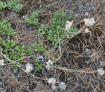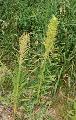 Apocynum cannabinum is a perennial herb with branched stems coming from rhizomes, erect to ascending and growing from 0.6-2 m tall. Green to lightly red stems are alternate to opposite in orientation. The leaves are simple, opposite, ascending to erect with entire margins, sessile below and with short petioles above. The blades oblong to lanceolate, 2-14 cm long and 0.3-5 cm wide. Inflorescences are generally dense terminal cymes; the flowers erect to slightly drooping. The calyx is fused with lobes 1.2-3 mm long. The corolla is white to yellowish green, narrowly campanulate to urceolate, 2.6-4.7 mm long and 1.5-3 mm wide, with lobes that are less than half the length of the tube. The fruit are divergent to pendulous, straight to curved follicles, 7-22 cm long. Indian hemp blooms from May to September, the seeds (3-6 mm long) emerge from the follicles in late summer and fall. They are covered in white hairs that are 1.6-3 cm long. Plants can be found in prairies, roadsides, wooded waterways and sparsely wooded slopes in both east and west river in South Dakota.