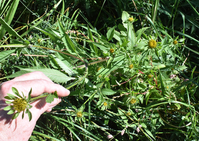 Toxicodendron rydbergii is a perennial shrub or subshrub with simple, unbranched stems 0.3-2 m in height and growing from branched subterranean stolons that often form thickets. Leaves are compound ternate, often drooping, each group of 3 at the end of a long stalk alternately attached to the woody main stem. Leaflets are up to 16 cm long and 11 cm wide, the center leaflet ovate to rhomboid, pointed at the tip and rounded or tapering at the base with toothed margins. The 2 lateral leaflets sessile or with short petioles and asymmetrical in shape, toothless or having a few large teeth, sometimes just on one side. The upper leaf surface is hairless and shiny, becoming dull with age; the underside is lighter in color with a few hairs along the midvein. Flowers are in small, paniculate clusters that arise from the leaf axils. Each small flower 1-3 mm across, has 5 sepals that are fused and green below and cream colored and free above. The 5 petals are cream colored with purplish veins and yellow stamens are usually visible. The fruit is a whit to yellowish globose drupe 4-7 mm in diameter that often persist into the next year. Poison ivy blooms in May and June and sometimes again later in the summer. Plants are found on prairie hillsides, stream banks, flood plains, roadsides and open woodlands throughout South Dakota.