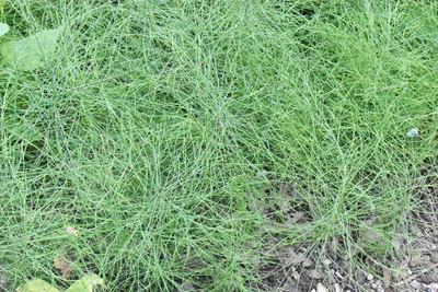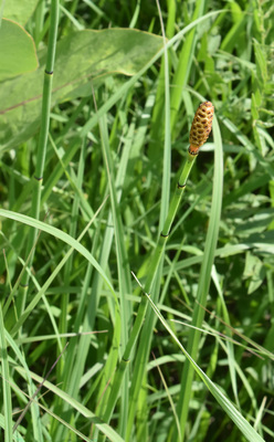 Equisetum arvense is a perennial, herbaceous vascular plant belonging to the family Equisetaceae. It has a complex root system composed of extensive rhizomes that facilitate vigorous asexual reproduction and spread. The plant produces separate fertile and sterile shoots. Sterile stems are green, photosynthetic, hollow, jointed, and rough-textured due to silica deposits; they are branched or unbranched, typically 30–60 cm tall. Fertile stems appear earlier, are unbranched, pale tan to brownish, and bear spores in cone-like sporangia (strobili) at their tips, 5–10 cm long. Leaves are reduced to small scales fused into sheaths at the stem joints. The plant reproduces via spores rather than seeds. Fertile shoots emerge in early spring, and sterile shoots develop afterward. Spores are produced in spring, and the plant continues vegetative growth throughout the growing season. Field horsetail is native to South Dakota, found in moist to wet habitats such as riverbanks, ditches, wet meadows, and disturbed wetlands, with broad statewide distribution.