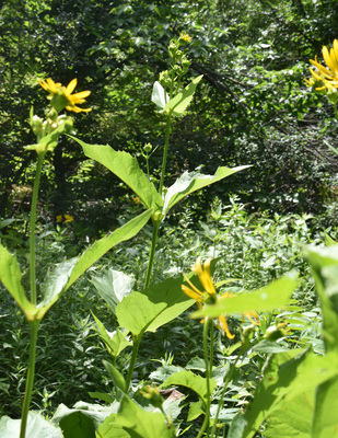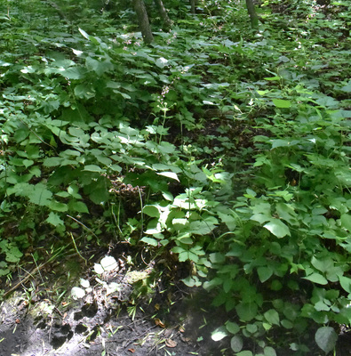 Aralia racemosa is a perennial herb with a somewhat wood base, the stems purplish to spotted, 1-2 m in height. The alternate, compound pinnate leaves have 3-7 leaflets, up to 20 cm long and 15 cm wide, the leaflets varying in size on the same leaf, each with a saw-toothed margin. The inflorescence consists of terminal and axillary panicles of umbels, 4-40 cm long. The flowers have 5 tiny sepals (< 1mm), 5 white petals, 1mm long, and 5 stamens. The fruit is a berry-like drupe, red to black in color, 5-6 mm in diameter. Spikenard flowers in July in wooded ravines and hillsides along the eastern edge of South Dakota.