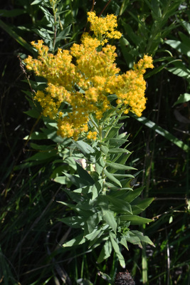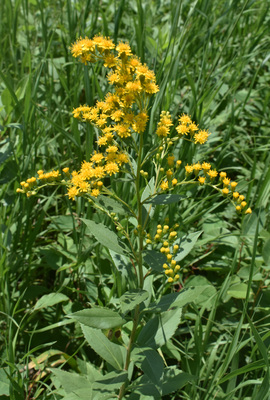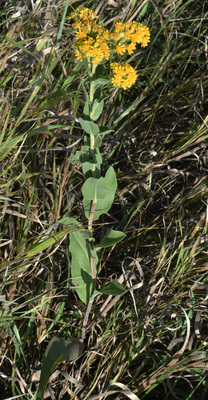 Zizia aurea is a perennial herb, erect with simple or branching stems which grow from a fleshy root and attain 30 to 100 cm in height. The basal leaves are ovate, compound 6-10 cm long, bipinnate or the middle leaflet pinnately cleft. The leaflets are ovate to lanceolate, 2-5 cm wide and 1-3 cm wide, and finely toothed. The petioles are 10-15 cm long. The cauline leaves are alternate, are similar to the basal leaves, ternate or irregularly compound. The inflorescences are loose compound umbels 5-8 cm across, attached to a long peduncle (5-15 cm) each with 7 to 15 umbellets attached by unequal pedicels (1-4 cm long) to terminal umbels of 10-15 flowers. Each tiny (< 3 mm) flower has 5 petals that remain nearly closed. The fruit is an oblong schizocarp 3-4 mm long and 1.5-2 mm wide. Golden Alexanders bloom from May to July in low prairies, on the margins of ponds, ditches, and in open woodlands.